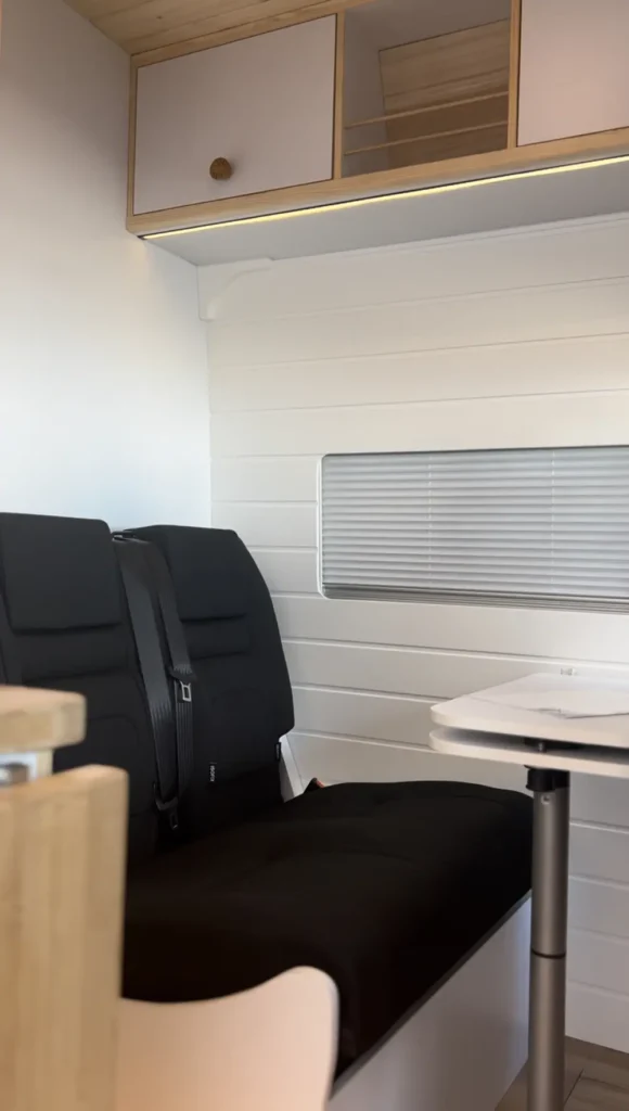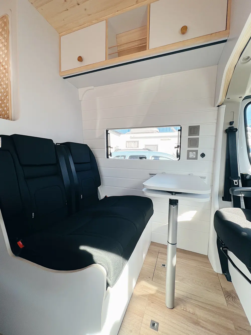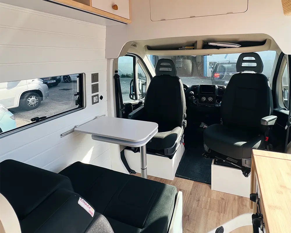 La distribución interior incluye asientos convertibles que se transforman en un área de comedor o en una estación de trabajo, asegurando que cada viaje sea tanto relajante como productivo. Los compartimientos de almacenamiento inteligentemente integrados permiten almacenar todo lo necesario para la vida en la carretera sin comprometer el espacio vital.