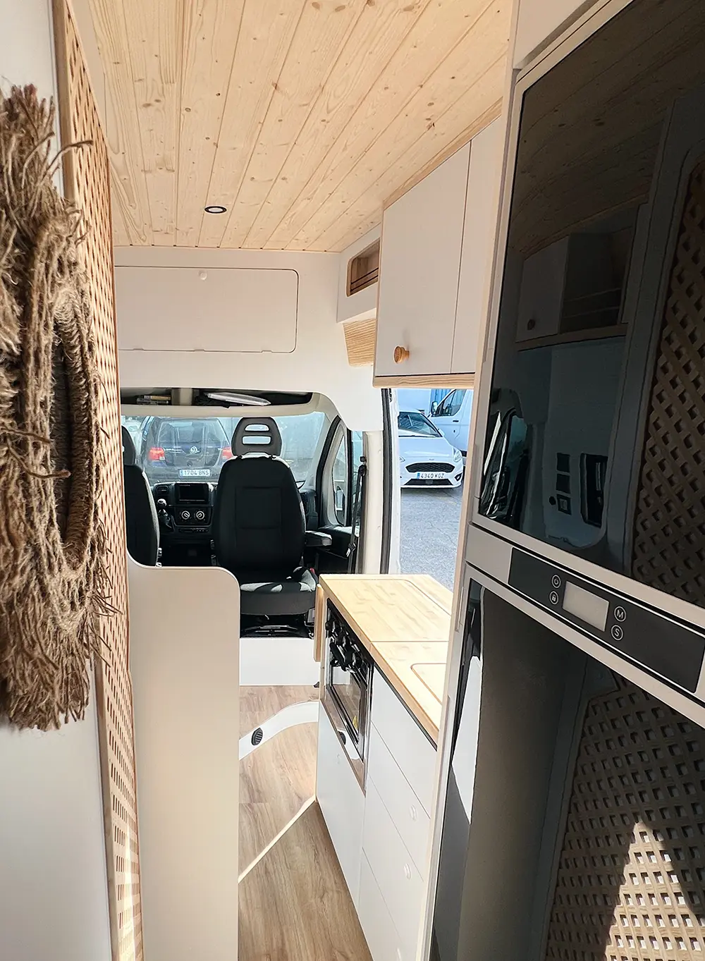 El interior de la Ducato L3H3 ha sido diseñado con un enfoque en la máxima optimización del espacio y la comodidad. Cuenta con un área de cocina totalmente equipada, completa con electrodomésticos modernos y superficies de trabajo de madera, que contrastan armoniosamente con los detalles en blanco y los acentos de madera clara en el techo y armarios.